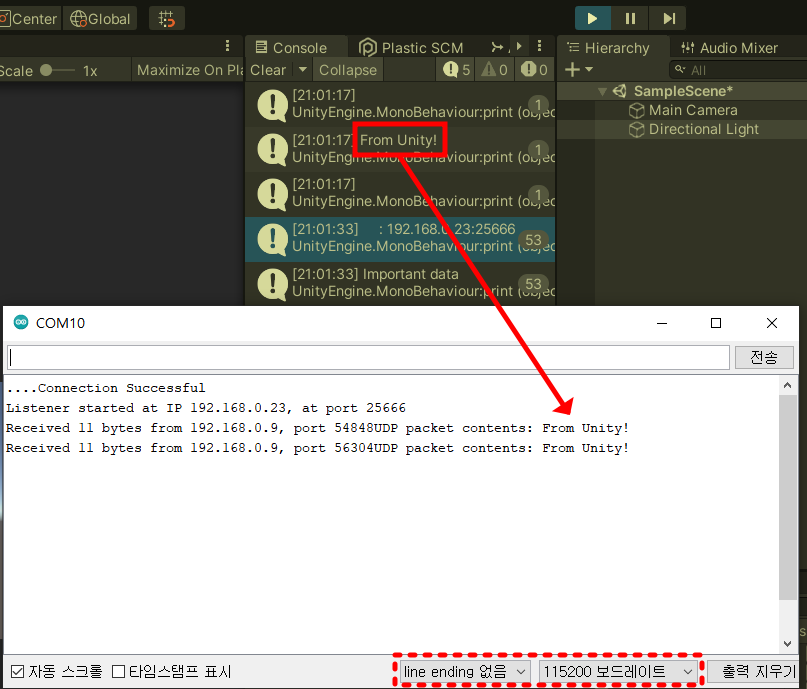 시리얼 모니터와 유니티 콘솔에서 연결을 확인합니다.