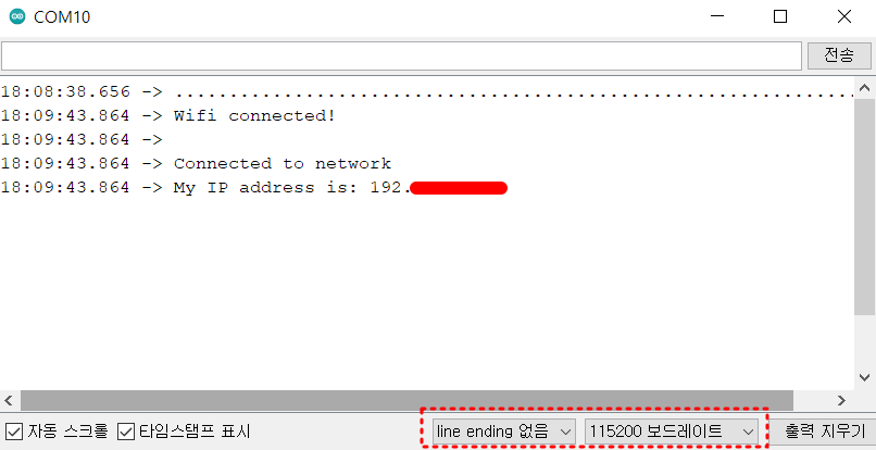 - 위와 같이 시리얼 모니터를 설정해 주어야 정상적으로 메시지가 출력됩니다.